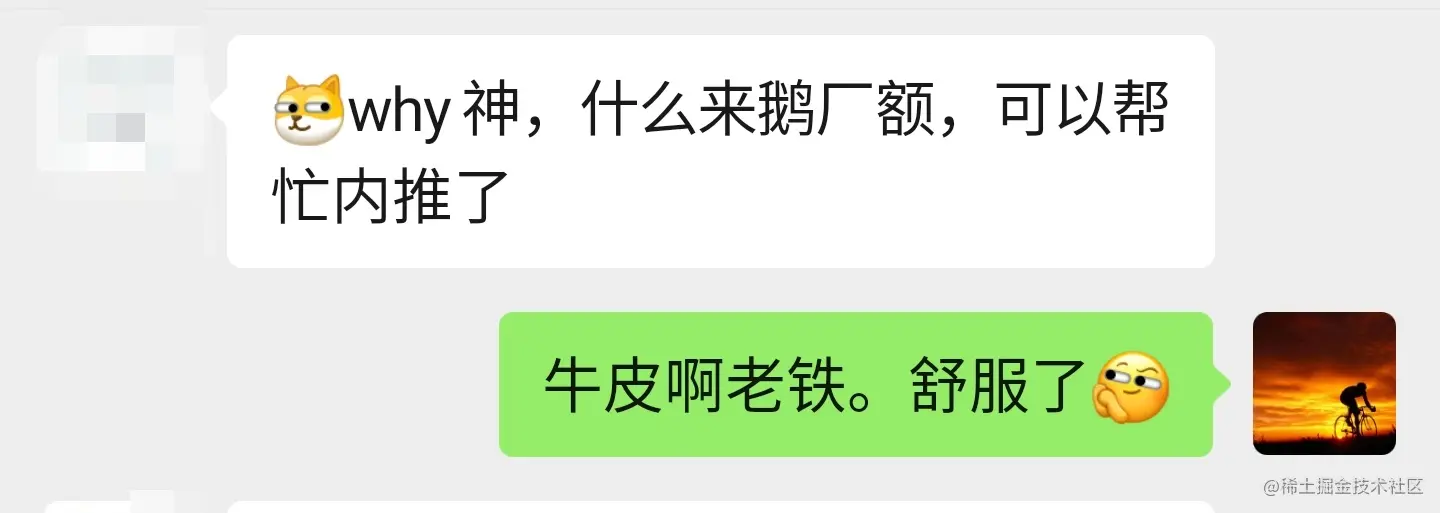 你说这问题对我来说那不是超纲了吗?我也没在大厂体验过啊。所以我怀疑他不讲武德,来骗,来偷袭我这个老实巴交的小号主,我希望他能耗子尾汁,在鹅厂好好发展: