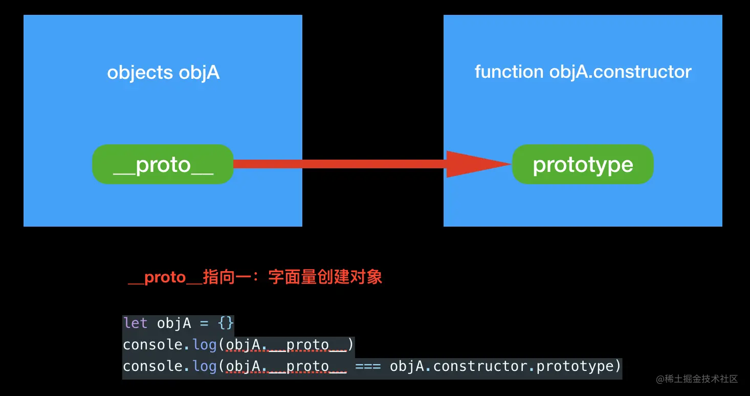- 我们在这里通过字面量方式创建的对象 objA, objA的原型 __proto__ 指向 objA的构造器 constructor的原型 prototype