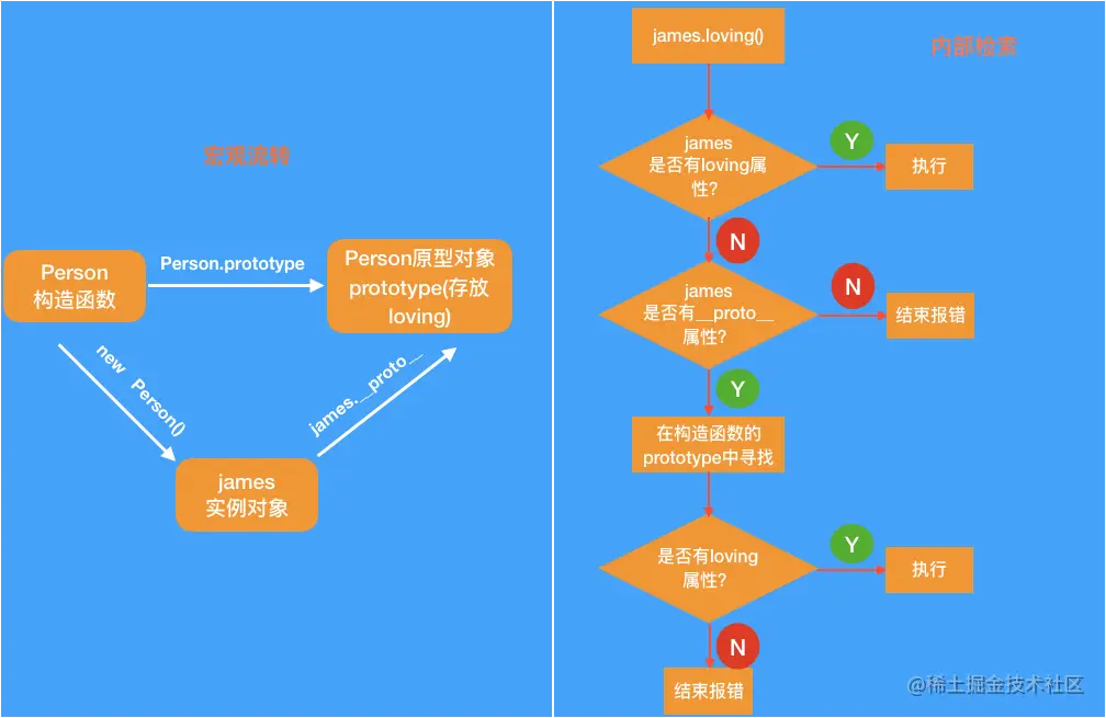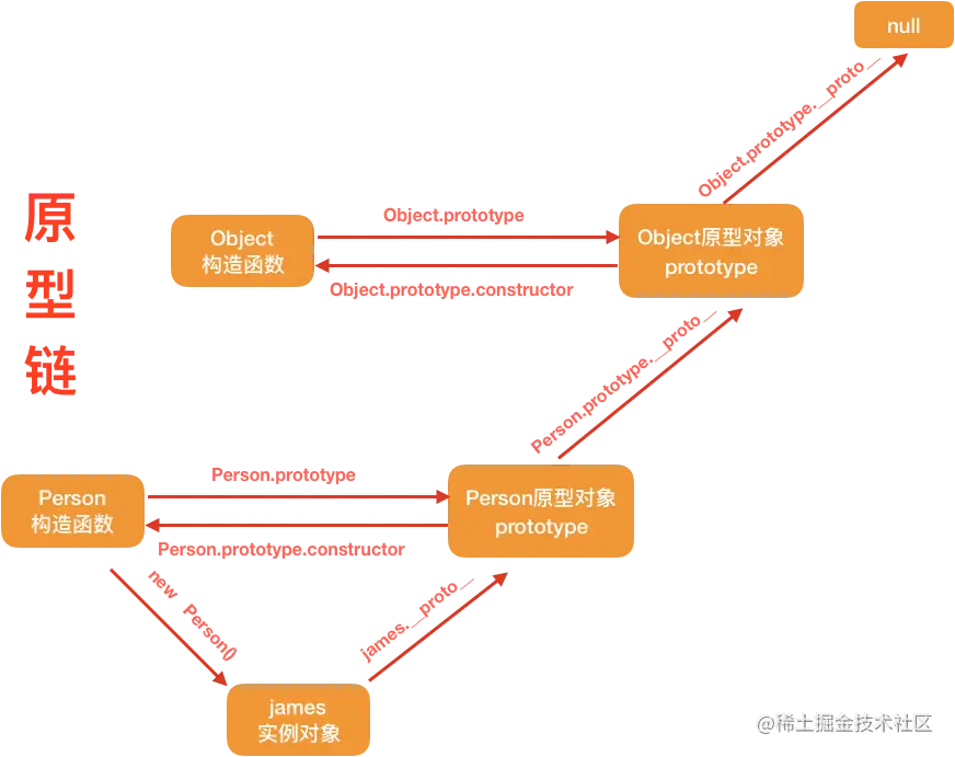 在 JavaScript 中,在对象实例和它的构造器之间建立一个链接——它是 __proto__属性,是从构造函数的prototype属性派生的——之后通过上溯原型链,在构造器中找到这些属性和方法。 __proto__ 的指向取决与对象创建时的实现方式。