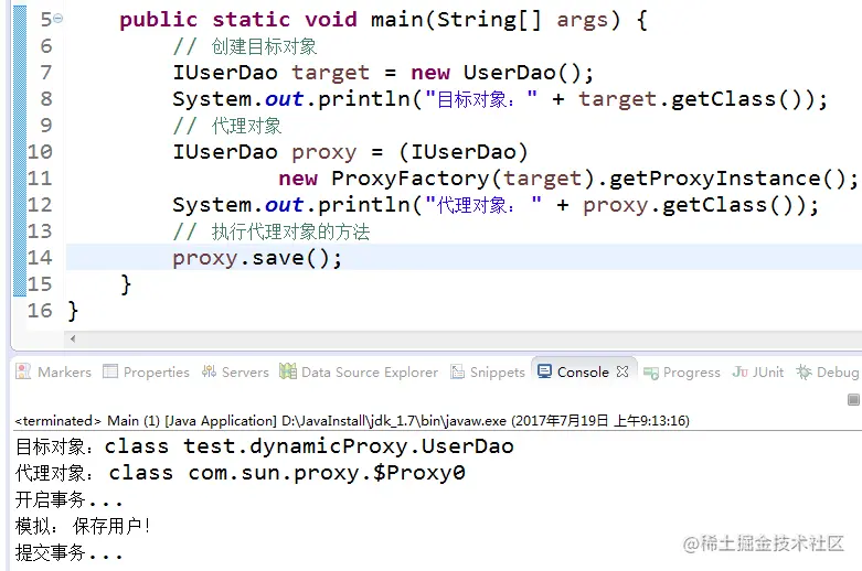package test.dynamicProxy;import java.lang.reflect.InvocationHandler;import java.lang.reflect.Method;import java.lang.reflect.Proxy;// 接口public interface IUserDao { void save(); void find();}//目标对象 class UserDao implements IUserDao{ @Override public void save() { System.out.println("模拟: 保存用户!"); } @Override public void find() { System.out.println("查询"); }}/** * 动态代理: * 代理工厂,给多个目标对象生成代理对象! * */class ProxyFactory { // 接收一个目标对象 private Object target; public ProxyFactory(Object target) { this.target = target; } // 返回对目标对象(target)代理后的对象(proxy) public Object getProxyInstance() { Object proxy = Proxy.newProxyInstance( target.getClass().getClassLoader(), // 目标对象使用的类加载器 target.getClass().getInterfaces(), // 目标对象实现的所有接口 new InvocationHandler() { // 执行代理对象方法时候触发 @Override public Object invoke(Object proxy, Method method, Object[] args) throws Throwable { // 获取当前执行的方法的方法名 String methodName = method.getName(); // 方法返回值 Object result = null; if ("find".equals(methodName)) { // 直接调用目标对象方法 result = method.invoke(target, args); } else { System.out.println("开启事务..."); // 执行目标对象方法 result = method.invoke(target, args); System.out.println("提交事务..."); } return result; } } ); return proxy; }}