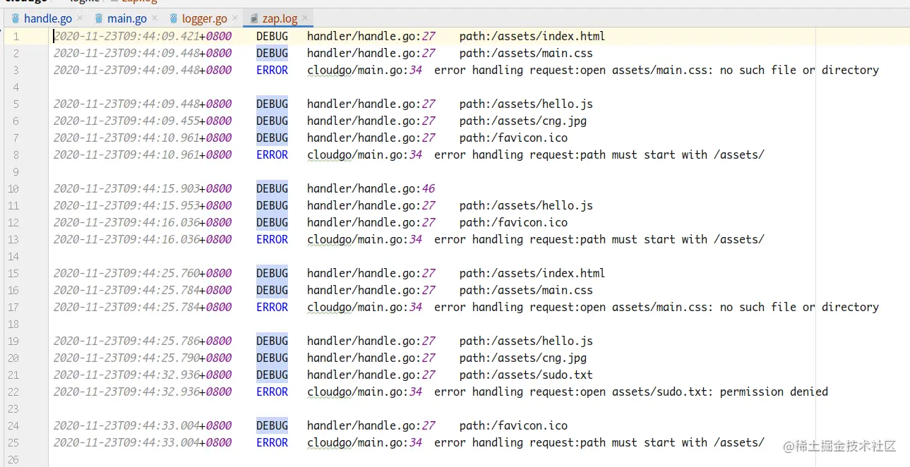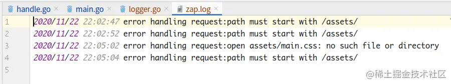 之后正常启动,原本log.Printf的内容都会打印在控制台,现在则都会打印到zap.log,就像这样: