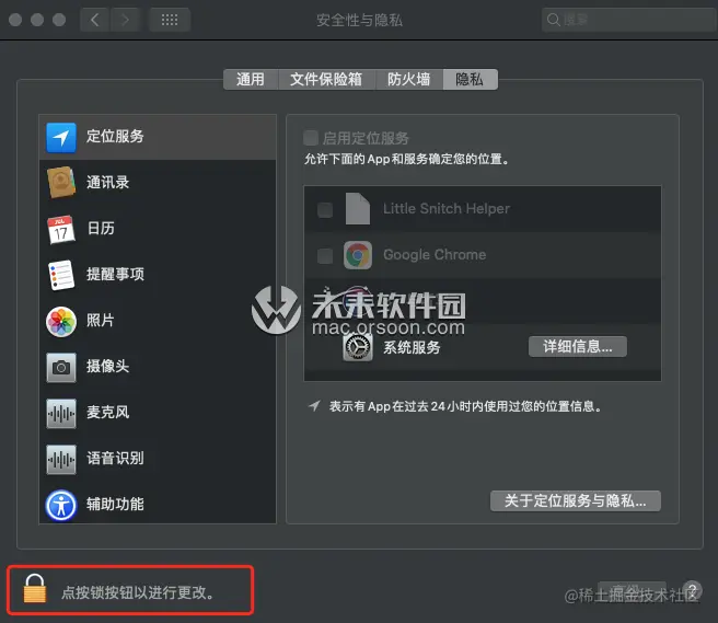 6.滚动到应用列表的底部以显示“系统服务”,然后点按“详细信息”按钮来查看使用您位置的特定系统服务。“基于位置的建议”将允许 Safari 建议或“聚焦建议”使用 Mac 的位置。