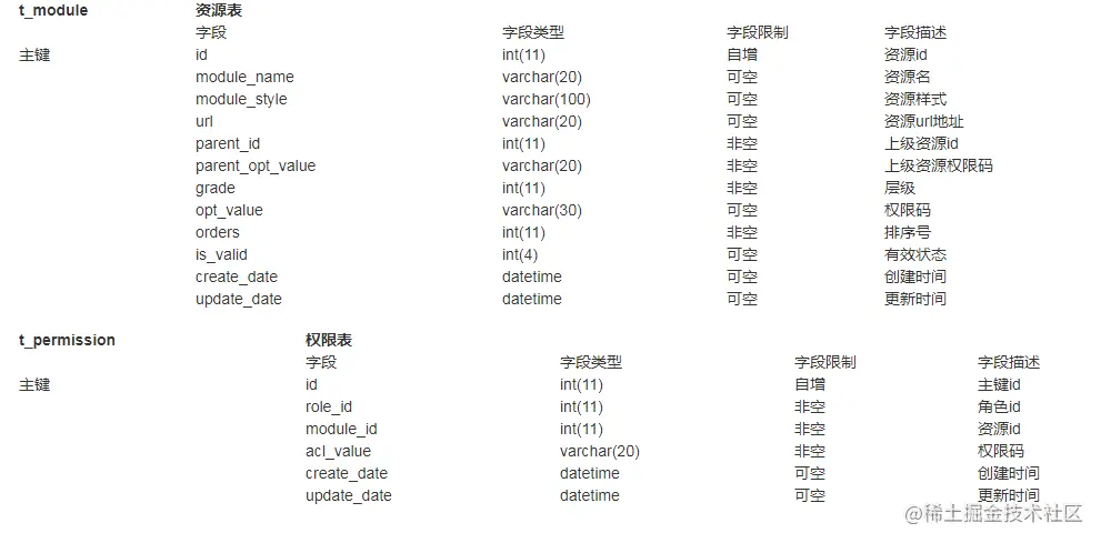 这用户与角色实体对应关系为多对多,角色与资源对应关系同样为多对多关系,所以在实体设计上用户与角色间增加用户角色实体,将多对多的对应关系拆分为一对多,同理,角色与资源多对多对应关系拆分出中间实体对象权限实体。