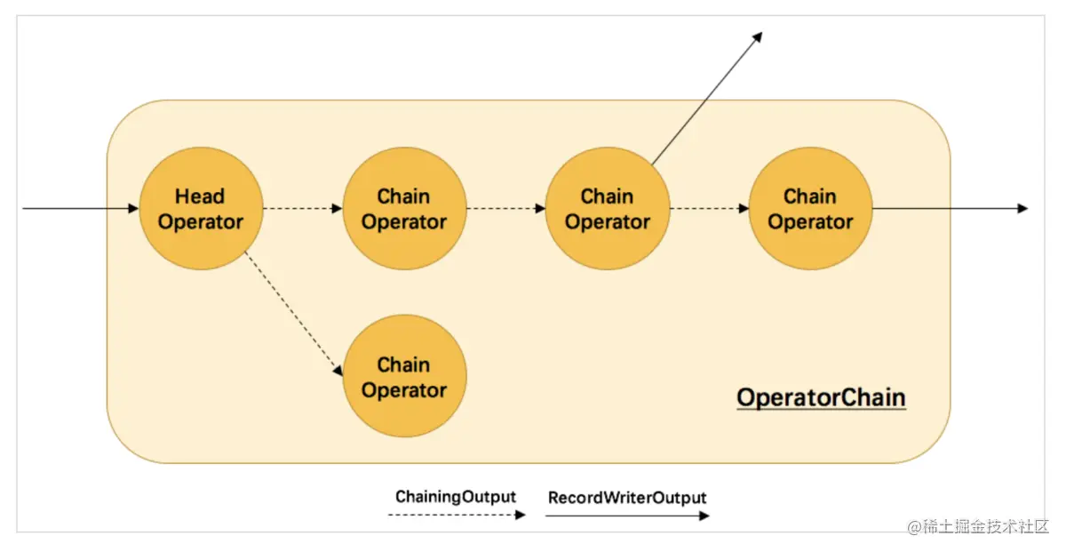 打通了算子链在执行层的逻辑,看官应该会明白 chainEntryPoint 的含义了。由于它位于递归返回的终点,所以它就是流入算子链的起始 Output,即上图中指向 headOperator 的 RecordWriterOutput。