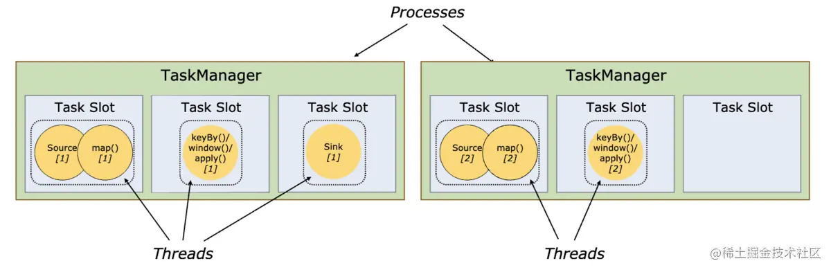 当然上述是一种特殊情况。我们更常见到的是只有部分算子得到了算子链机制的优化,如官方文档中出现过多次的下图所示,注意 Source 和 map() 算子。