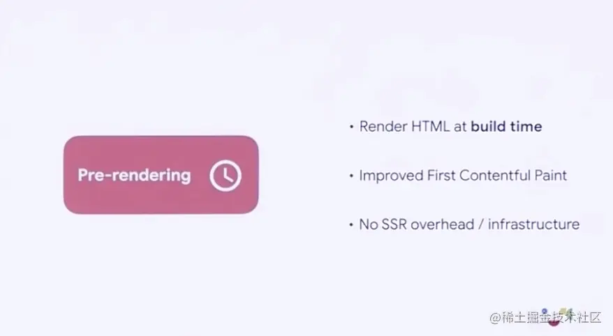 对于不经常发生变化的内容来说,使用预渲染是一种很好的办法,它在代码构建时就通过框架能力生成好静态的 HTML 页面,而不是像同构应用那样在用户请求页面时再生成,这让它可以几乎立刻返回页面。