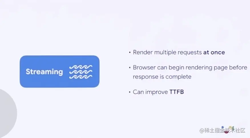 流式渲染可以让服务端对大块的内容分片发送,使得客户端不需要完整的接收到 HTML,而是接受到第一部分时就开始渲染,这大大提升了 TTFB 首字节时间。