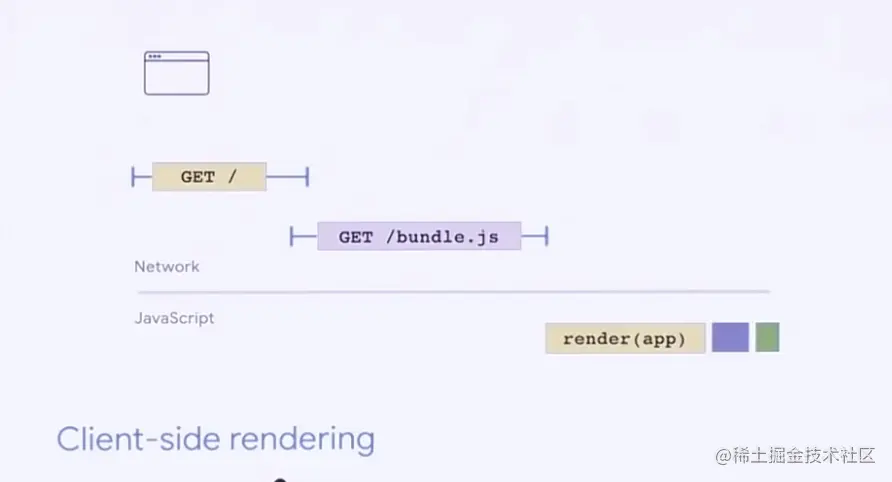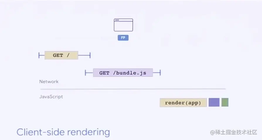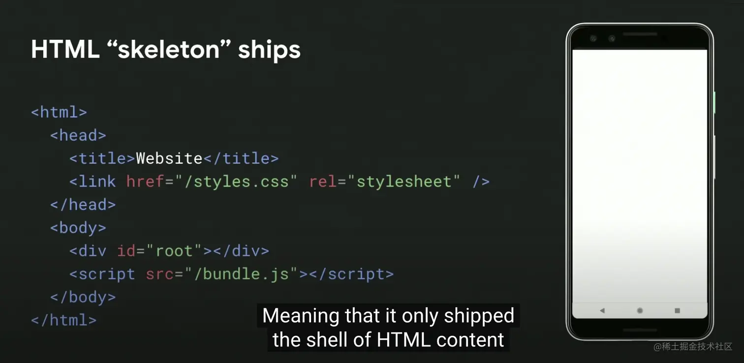 从服务端获取 HTML、CSS、JavaScript 都是需要成本的,以一个 CSR(客户端渲染)的网站为例,客户端渲染的网站依赖框架库(bundle)、应用程序(app)来进行初始化渲染,假设它有 1MB 的 JavaScript Bundle 代码,那么只有当这一大段的代码加载并执行完成以后,用户才能看到页面。