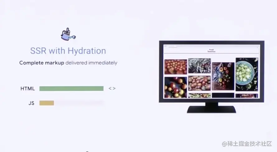 等到页面渲染后,再利用框架提供的 Hydration(注水)能力,让服务端返回的“干瘪”的 HTML 注册事件等等,变的丰富起来,拥有了各种事件后,就和传统 CSR 一样拥有了丰富多彩的客户端交互。