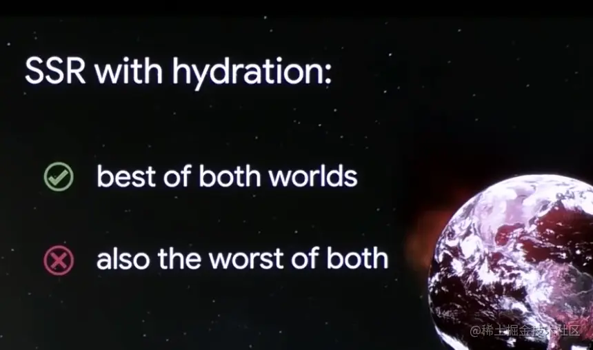 并且对于 FID 也就是 First Input Delay 第一输入延迟这个指标来说,由于 SSR 快速渲染出内容,更容易让用户误以为页面已经是可交互状态,反而会使「用户第一次点击 - 浏览器响应事件」 这个时间变得更久。