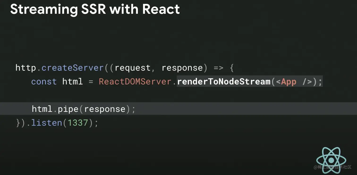 在 React 中,可以通过 renderToNodeStream 来使用流式渲染: