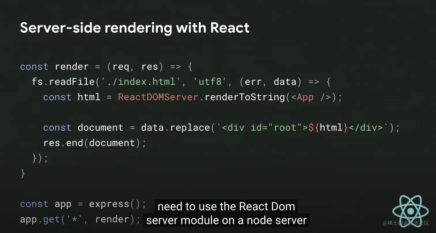 首先 render 部分,利用 dangerouslySetInnerHTML 来使得这部分初始化为空的 html 文本,并且由于 server 端肯定还是和往常一样全量渲染内容,而客户端由于初始化需要先不做任何处理,会导致 React 内部对于服务端内容和客户端内容的「一致性检测」失败。
