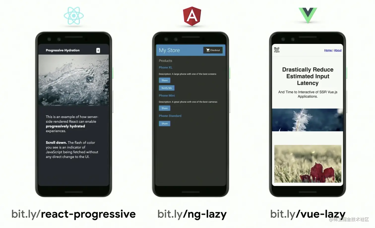 接下来,组件在客户端初始化的时候,利用 IntersectionObserver 监控组件元素是否进入视图,一旦进入视图了,才会动态的去 import 组件,并且利用 ReactDOM.hydrate 来真正的进行注水。