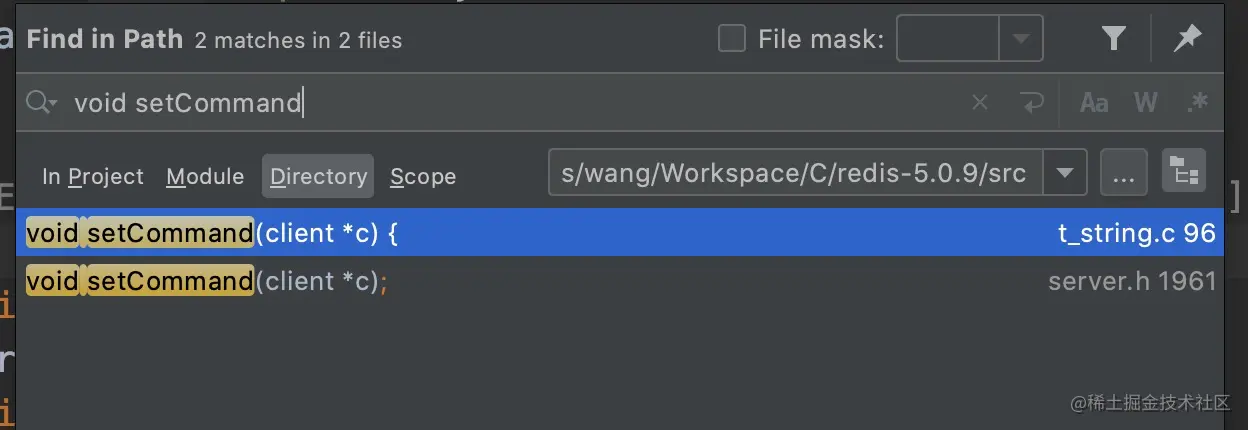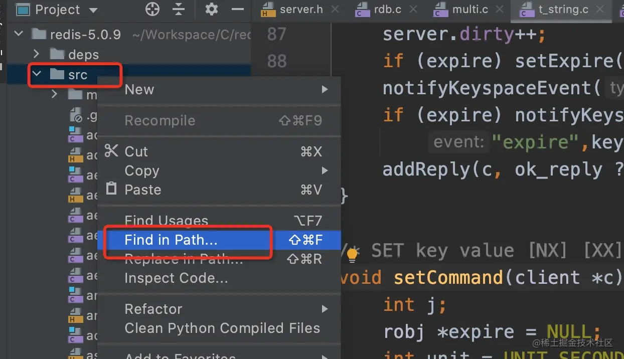 Redis的命令实现函数,都有固定的命名格式的void xxxCommand,所以大家可以在源码目录src下直接搜索。如set命令: