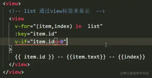 <view v-for="(item,index)" in list :key="item.id">{{item.id}} --- {{item.text}} --- {{index}}</view>