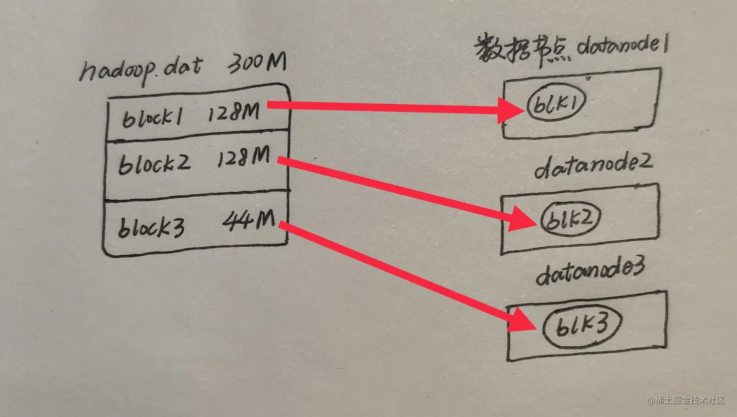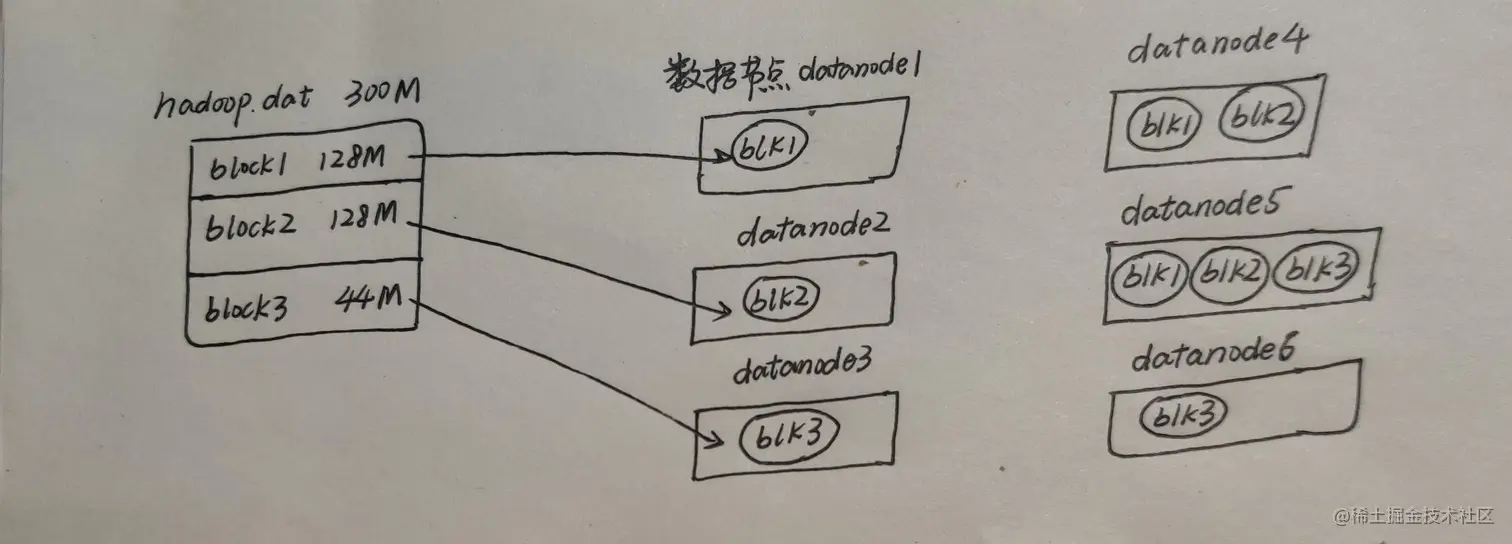 在HDFS3.0上的文件,它是按照128M为单位,切分成一个个block,分散的存储在集群的不同的不用数据节点DataNode上。