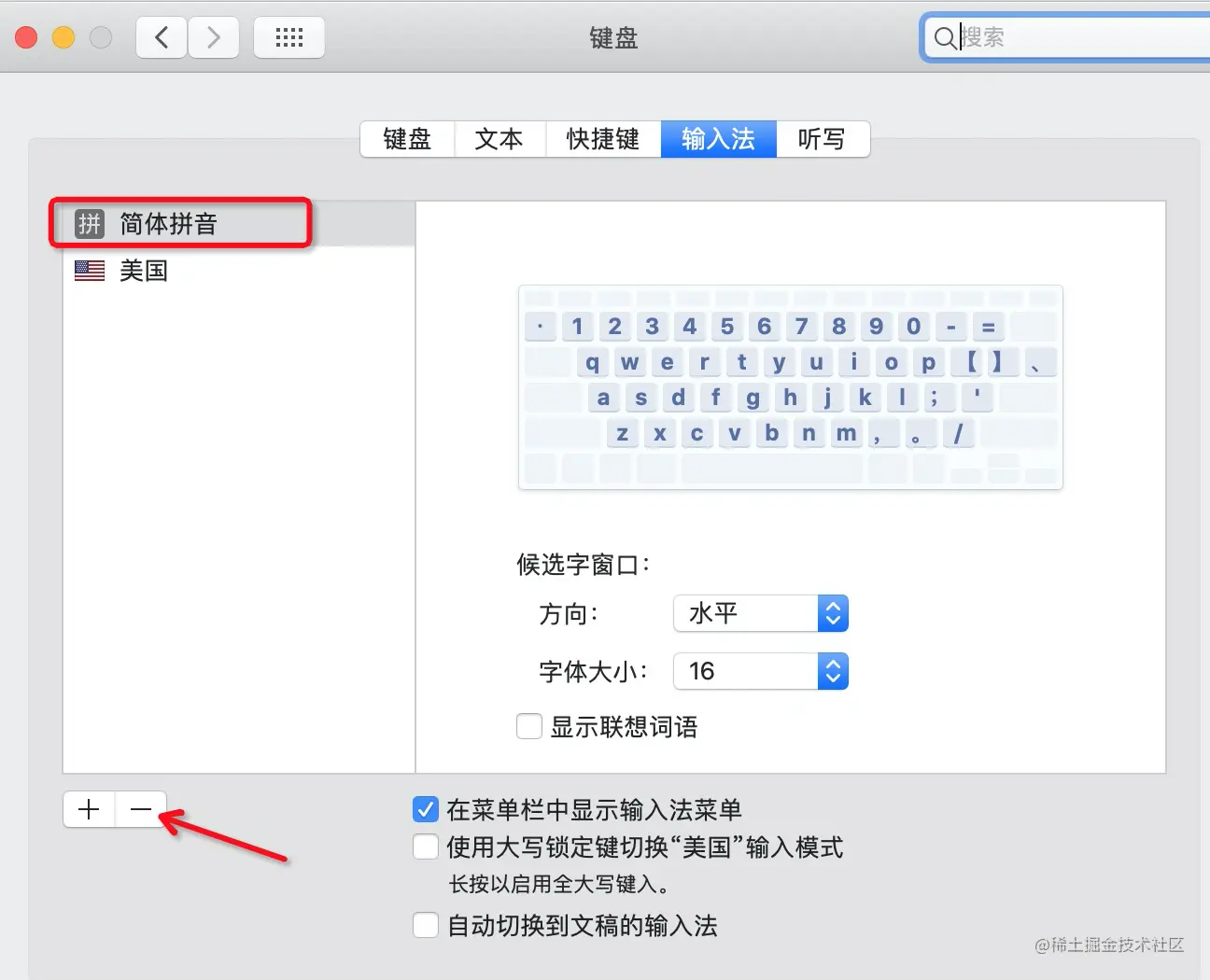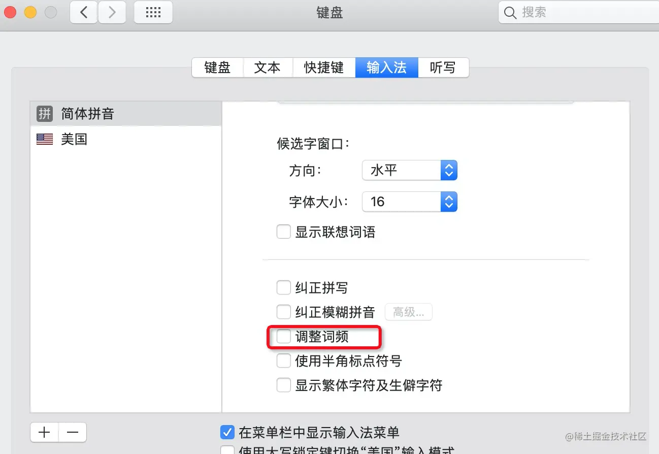 macOS自带拼音输入法清除词频 量子跳动 2020-11-23 6,422 阅读1分钟 macOS自带的拼音输入法默认有词频功能,日常输入中总有一些敏感词不想被记录,而且有时还会抽风的记录一些莫名奇妙的词频。 这些错误的词频记录通过通过Shift+Delete(网查找的方案)也删不掉。 尝试在“苹果菜单”()>“系统偏好设置”>“键盘”>“输入法”,移除所有输入法并重新添加,问题解决。 特此记录一下!! 此后使用将词频禁掉,终于舒坦了。
