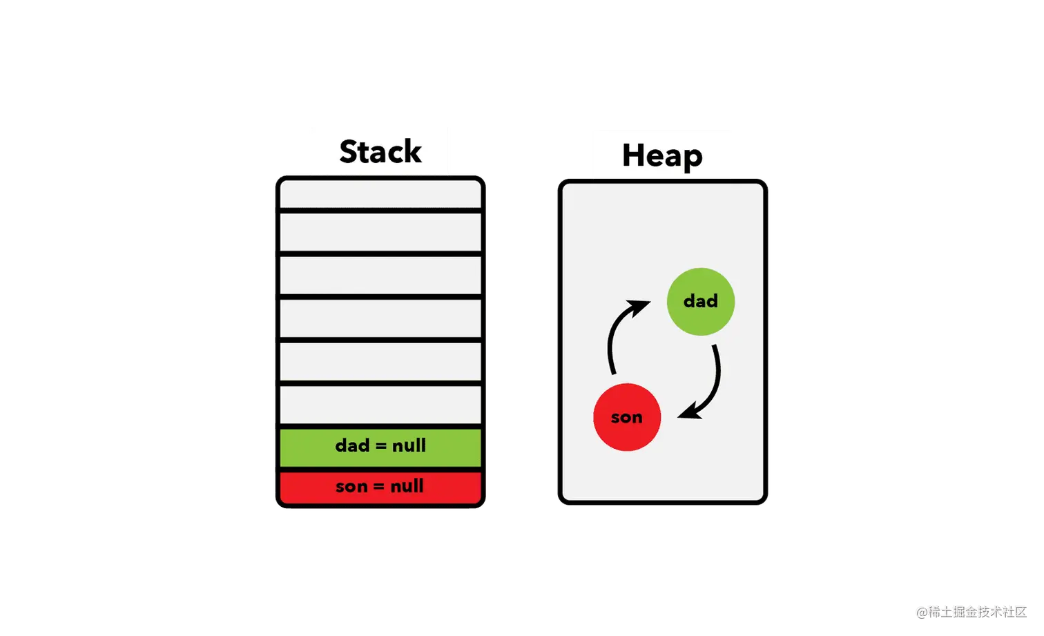 虽然在不使用son 和dad 的时候,将它们都置为null。这只是将它们与stack中的引用脱离的关系,但是在heap中,他们还彼此引用。
