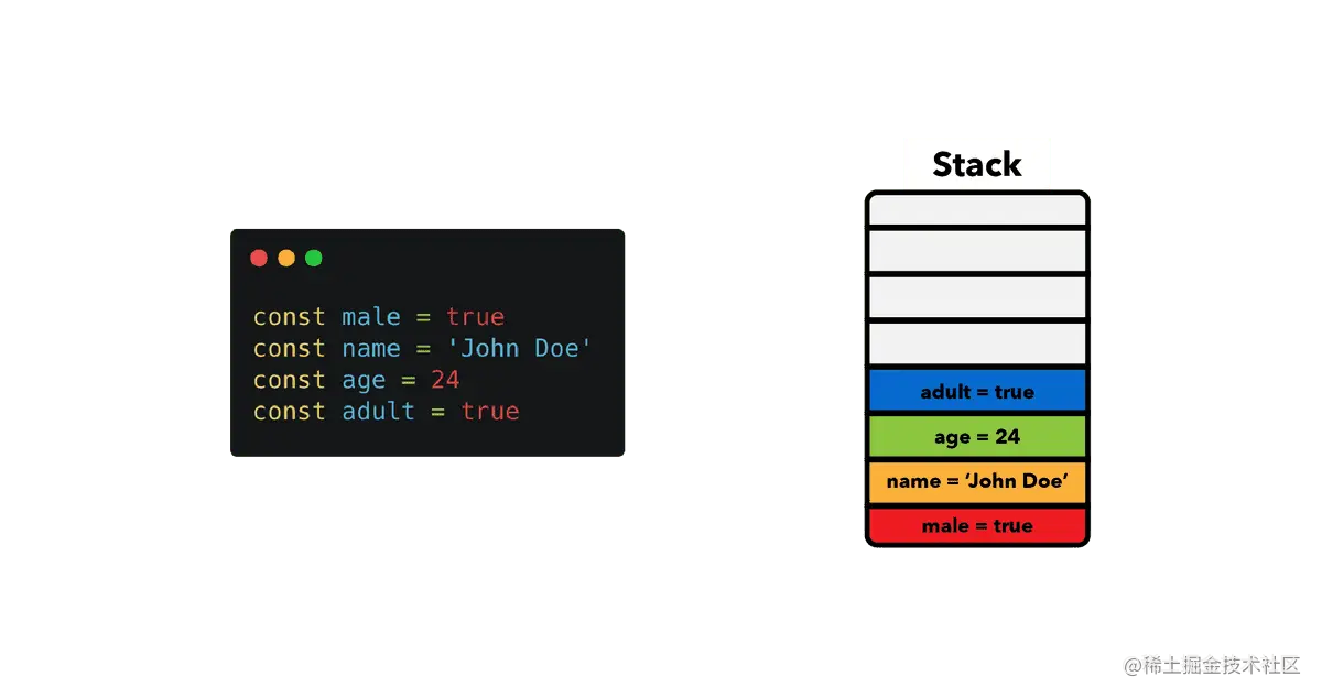 由于JS引擎知道它们的大小不会发生更改,所以每次都会为其分配指定大小的内存空间。