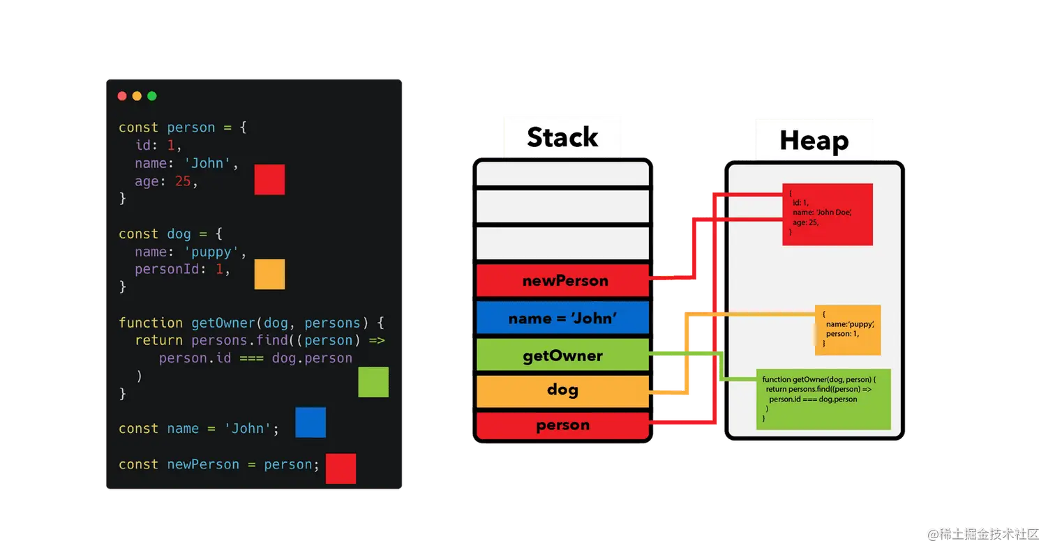所有变量都在stack中存在指定的信息。 在上文中我们得知,stack中存储两种类型的值- 原始类型和引用类型。 原始类型我们不用过多解释,而引用类型需要着重解释一下。