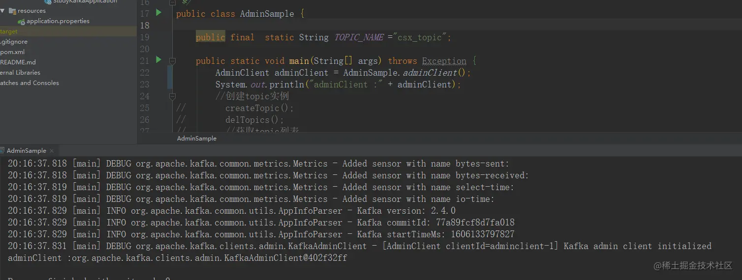 CreateTopicsResult topics = adminClient.createTopics(Arrays.asList(newTopic));