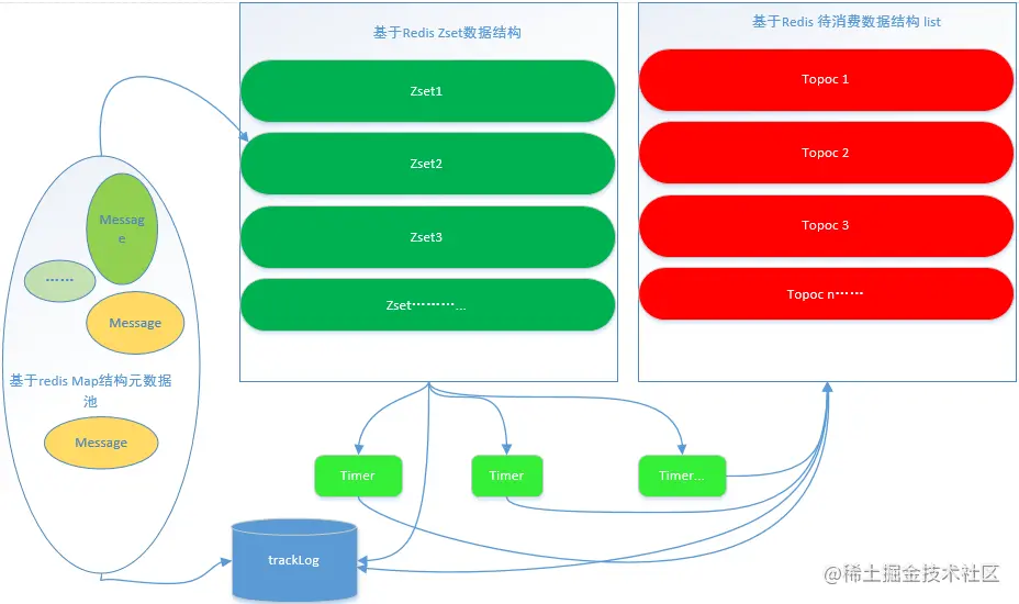 - 使用timer实时监控zset有序列表中top 10的数据 。 如果数据score<=当前时间毫秒就取出来,根据topic重新放入一个新的可消费列表(list)中,在zset中删除已经取出来的数据,并修改状态为待消费