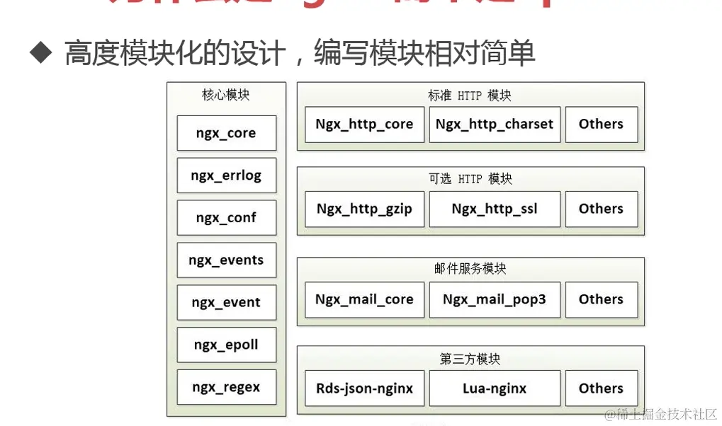 模块化的设计,增强了nginx的灵活性,可以让用户自己选择需要的模块,如下图