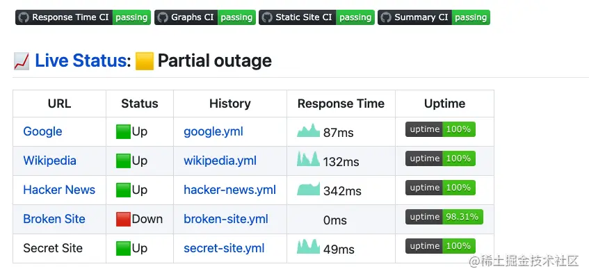 New Upptime 是一个开源的正常运行时间监控和状态页面,可直接在页面查看到各个网站的连接状况、响应时间、可靠度。由 GitHub 提供技术支持,采用 GitHub Action 实现运行时间监控器,GitHub issue 作事件报告及 GitHub Pages 生成状态网站。