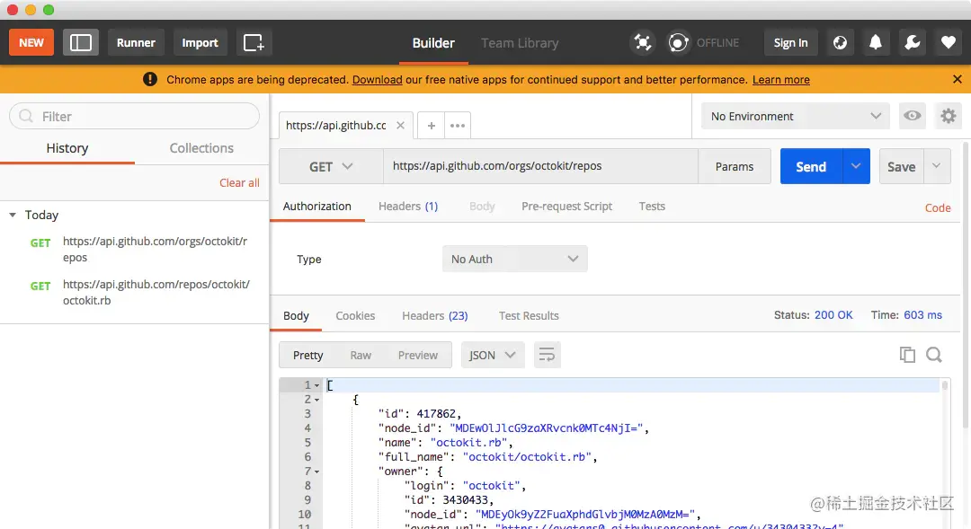 Postman 会当作 Chrome 应用程序安装到你的电脑上,打开后我们可以选择请求方式(GET/POST),输入请求 URL 以及设置传递参数来进行接口的调用。
