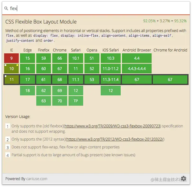 使用 Chrome 插件形式的 Can I Use 我们可以快捷的查看项目中用到的某一特性的浏览器支持范围,同时还可以查看支持程度和兼容方式。