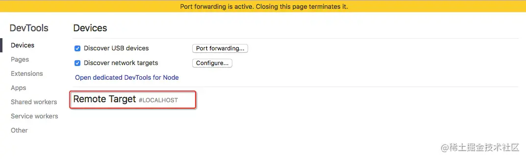 inspect,我们可以在 Chrome 地址栏输入:chrome://inspect/ 来捕获手机访问的页面地址,前提是你的 Android 手机通过数据线连接上了电脑并开启了相应权限,最后获取到的地址会在 Remote Target 中显示: