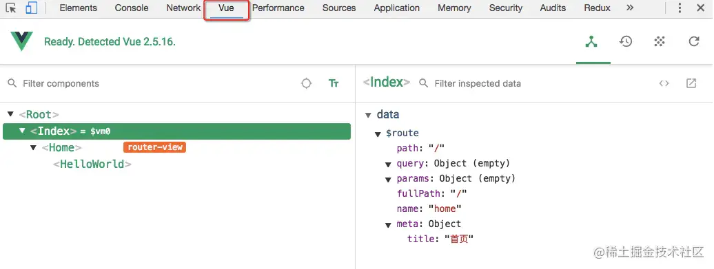 成功安装它之后,在 Vue 项目的页面中我们可以打开 Chrome 控制台选择 Vue 的 tab 进行页面调试。