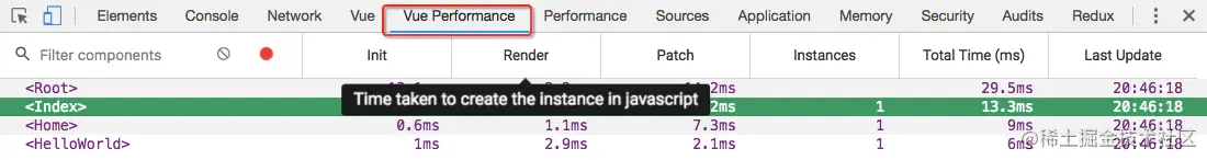 Vue Performance Devtool 这款插件,它可以分析我们页面中各个组件的性能情况,从而在其基础上我们可以有针对性的对组件的代码进行优化,如下图所示: