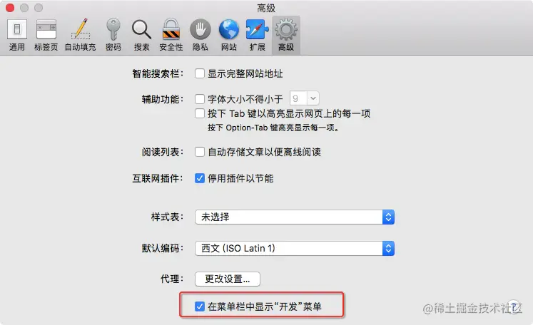 2. 打开 Mac 上的 Safari 的 “开发”菜单,一般情况下默认是开启的