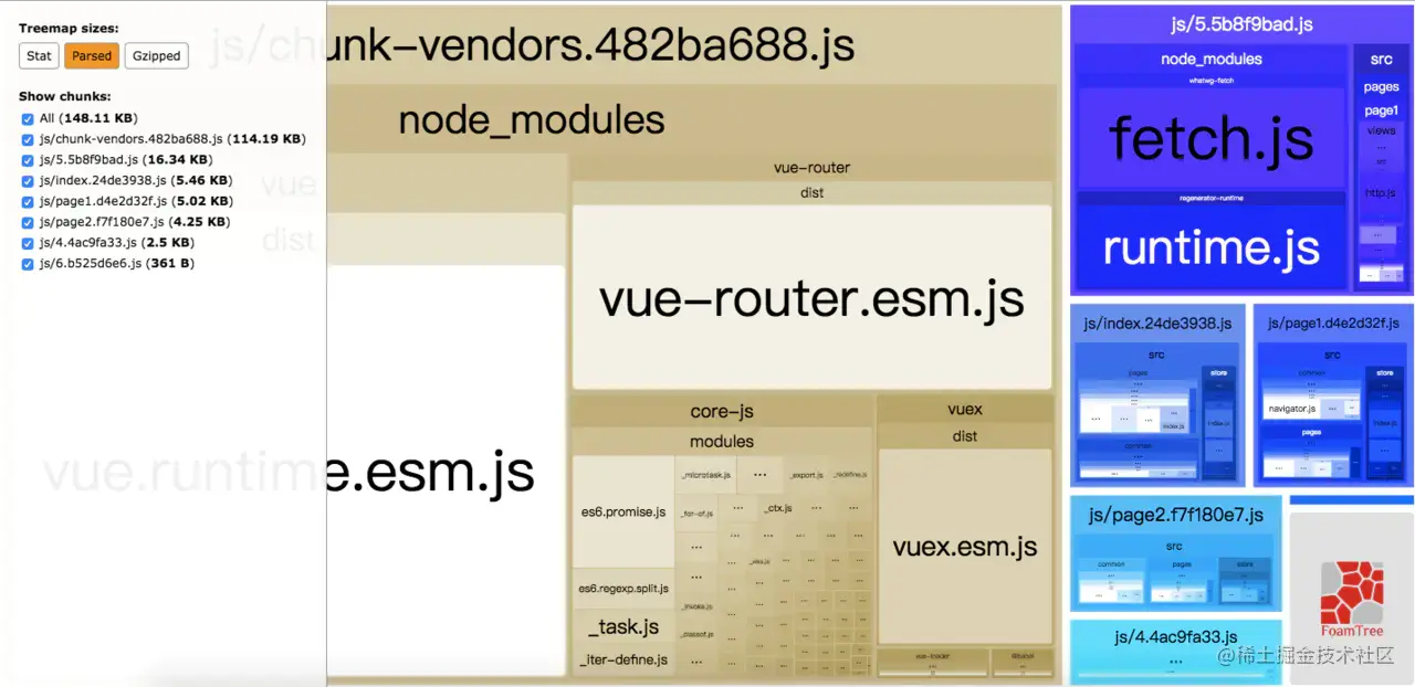 图中区域内包含了我们打包出的所有 js 文件,我们可以以不同的颜色进行区分,同时我们也可以点击某一区块进行放大观察,以此来分析是否存在较大或重复的模块。而在页面左侧存在一个筛选面板,在该面板中我们能勾选需要查看的文件来进行显示,同时也可以切换查看原始、普通及