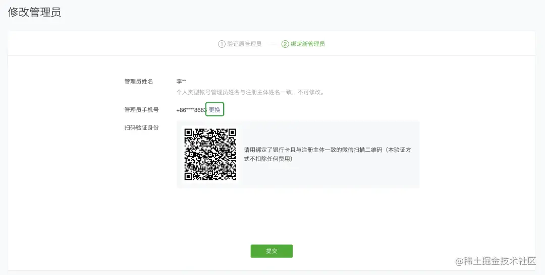 认证过后,点击手机号更新按钮,写入管理员手机号,并再次微信扫码验证身份,提交。