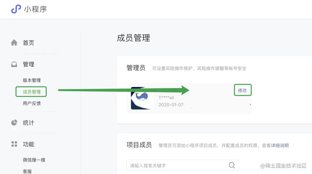 进入小程序管理后台之后,点击成员管理,在管理员处点击修改按钮: