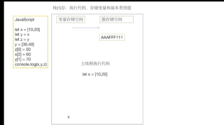 let x = [10,20]、 y=[30,40]是新增,新增值新增引用地址创建堆,y[1] 、 z[0]是修改,修改变量属性查询引用地址,修改堆属性值