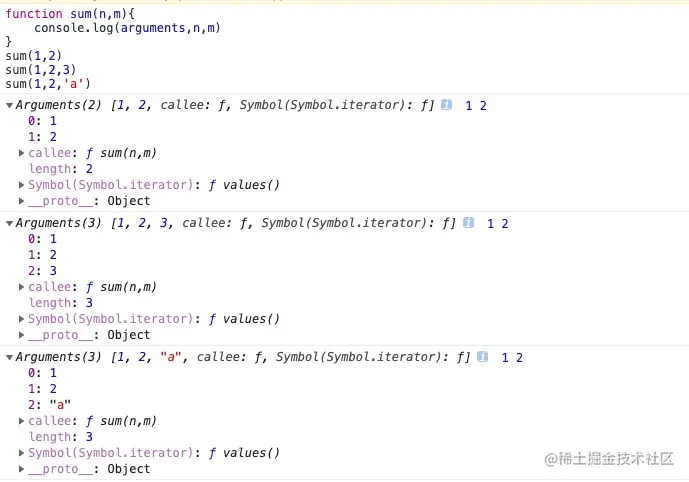 arguments集合中存储着所有函数执行时,传递的实参信息,length为参数个数