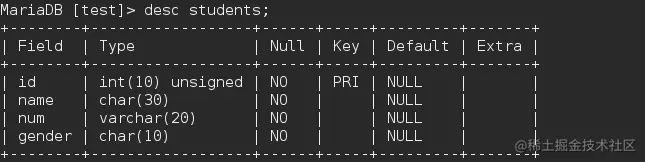 CREATE TABLE students (id int UNSIGNED NOT NULL PRIMARY KEY,name VARCHAR(20)NOT NULL,age tinyint UNSIGNED);