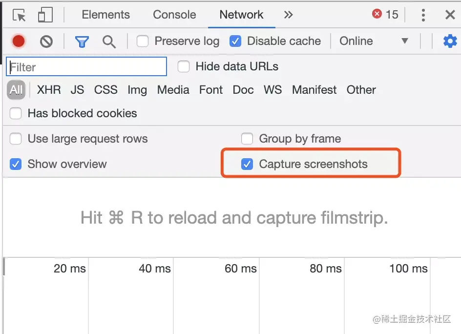 启动Network 面板下的Capture screenshots就可以在页面加载时捕捉屏幕截图。有点幻灯片的感觉。