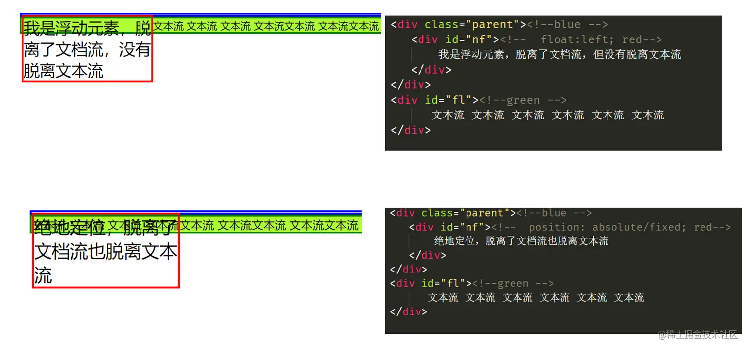 浮动会使元素脱离文档流(其他块级元素计算高度时会忽略浮动元素),但是不会脱离文本流,在于其他盒子的文本内容计算布局的时候,还是占位置的。