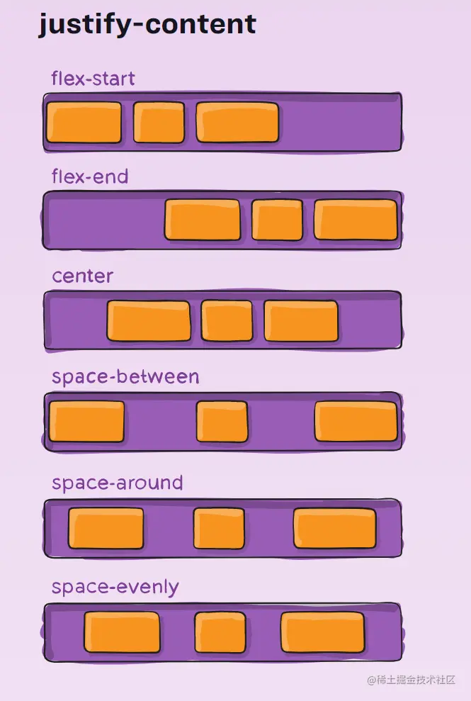 justify-content 定义了项目在主轴上的对齐方式(图片来源于css-tricks.com/)
