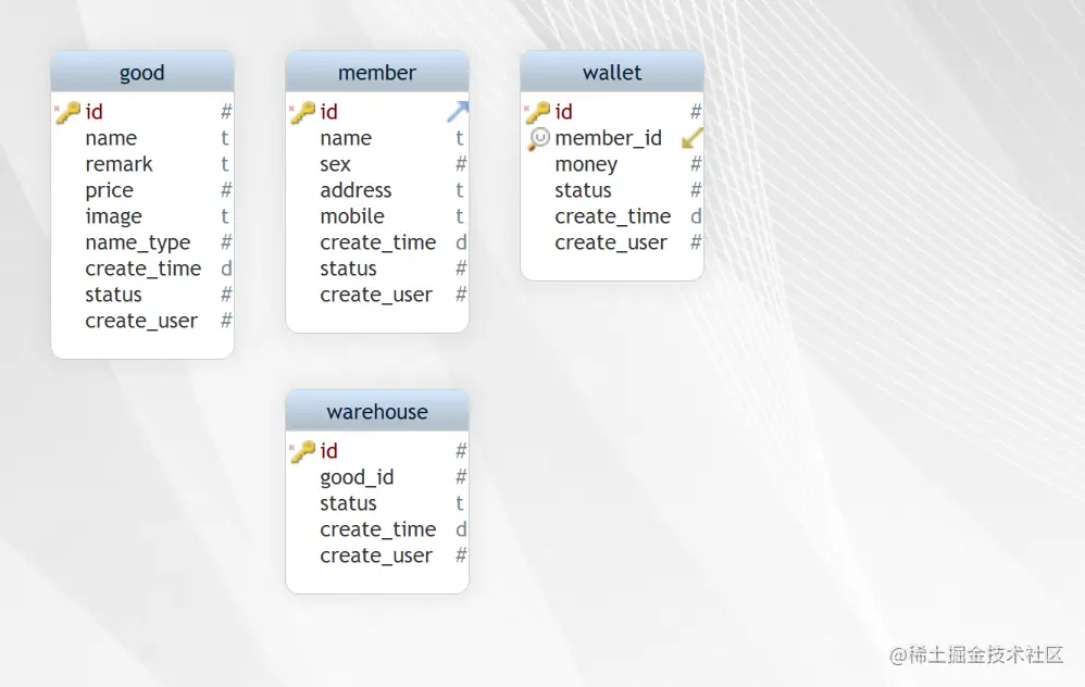 - 收银台:会员钱包,收款金额。 根据以上的信息我们先建立已个数据库。
