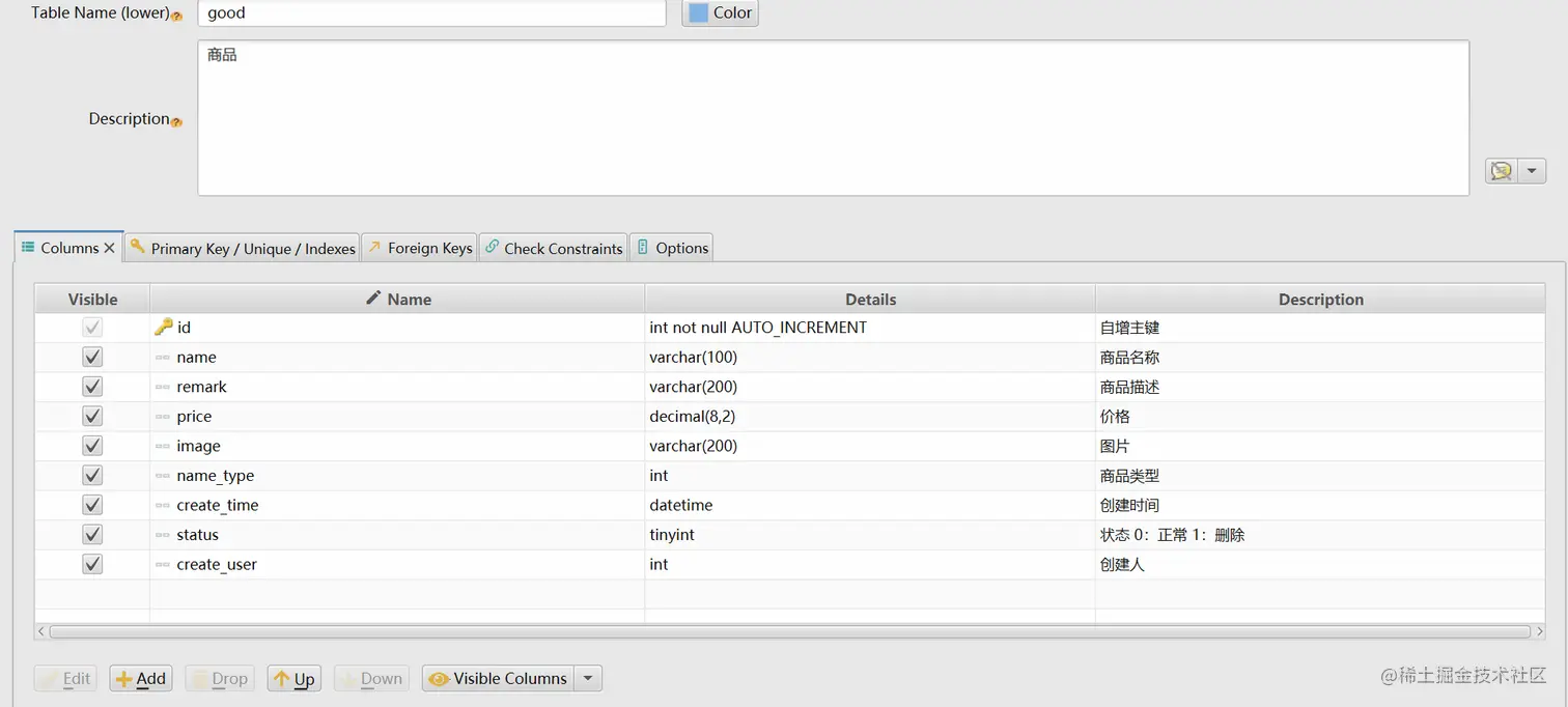 在右边空白处右键create table,现在根据我们上面的基本结构图来设计表吧。先创建商品表,其中create_time,status,create_user每张表都必须要有的,为符合我们设计的表整体规范。点击确定后就会自动在数据库创建一张表了。