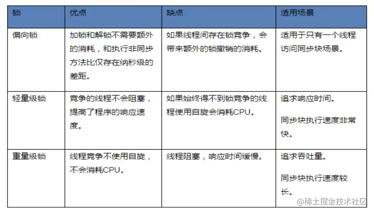 轻量级锁是由偏向锁升级来的,偏向锁运行在一个线程进入同步块的情况下,当第二个线程加入锁争用的时候,偏向锁就会升级为轻量级锁,轻量级锁通过自旋机制实现,所谓自旋就是指如果持有锁的线程能在很短时间内释放锁资源,那么那些等待竞争锁的线程就不需要做内核态和用户态之间的切换进入阻塞挂起状态,它们只需要等一等(自旋),等持有锁的线程释放锁后即可立即获取锁,这样就避免用户线程和内核的切换的消耗。但是线程自旋是需要消耗CPU的,说白了就是让CPU在做无用功,线程不能一直占用CPU自旋做无用功,所以需要设定一个自旋等待的最大时间。如果持有锁的线程执行的时间超过自旋等待的最大时间扔没有释放锁,就会导致其它争用锁的线程在最大等待时间内还是获取不到锁,这时争用线程会停止自旋进入阻塞状态,即升级为重量级锁。