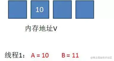 5.线程1重新获取内存地址V的当前值,并重新计算想要修改的新值。此时对线程1来说,A=11,B=12。这个重新尝试的过程被称为自旋。