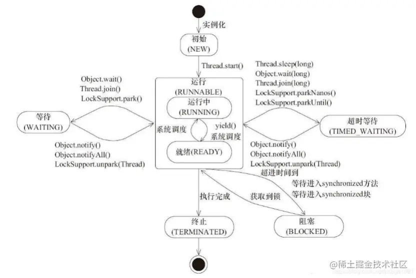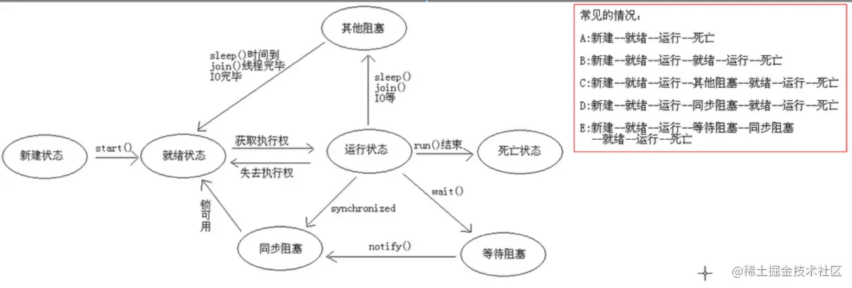 - 初始(NEW):新创建了一个线程对象,但还没有调用start()方法。