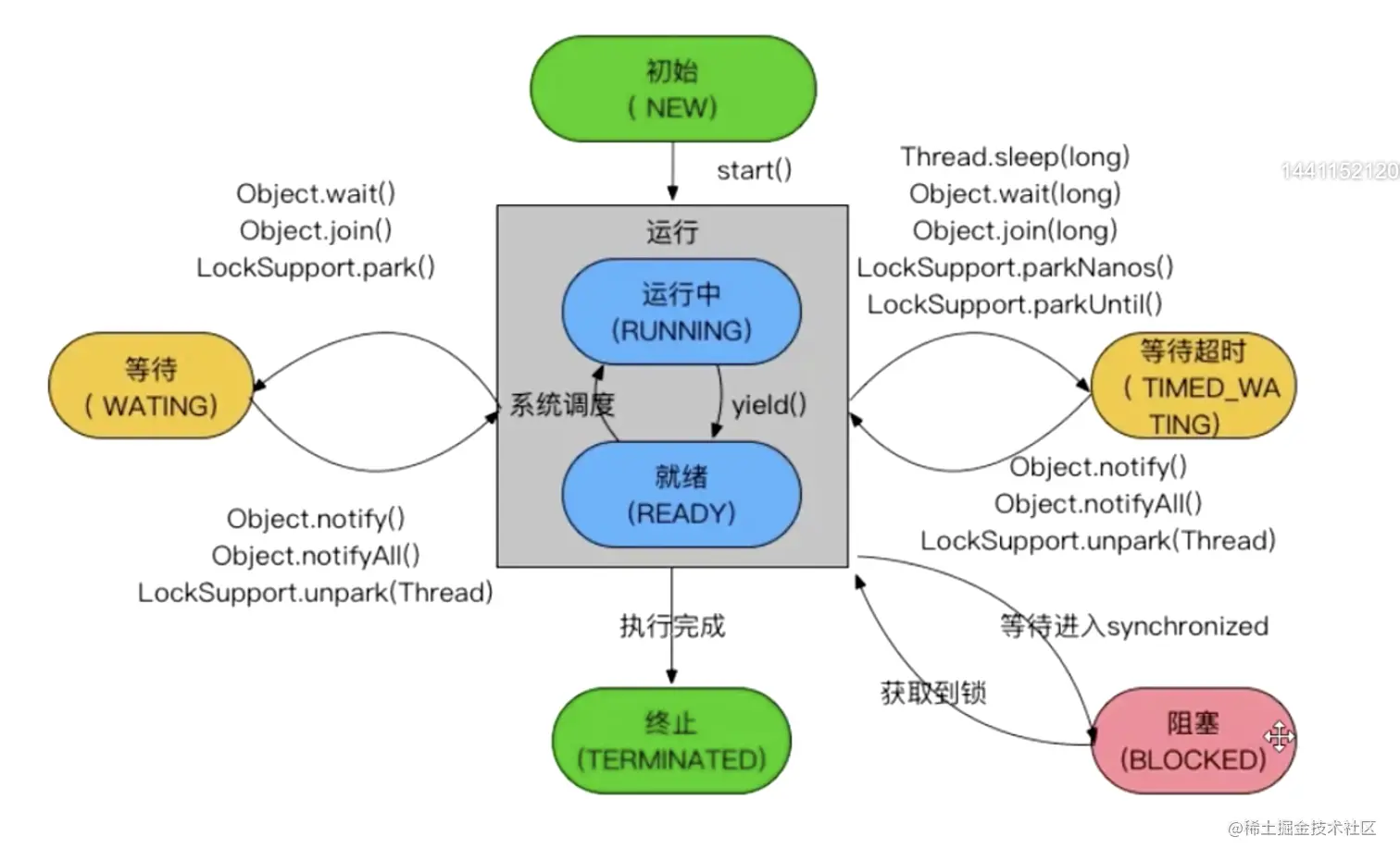 - 运行(RUNNABLE):Java线程中将就绪(ready)和运行中(running)两种状态笼统的称为“运行”。 线程对象创建后,其他线程(比如main线程)调用了该对象的start()方法。该状态的线程位于可运行线程池中,等待被线程调度选中,获取CPU的使用权,此时处于就绪状态(ready)。就绪状态的线程在获得CPU时间片后变为运行中状态(running)。 3. 阻塞(BLOCKED):表示线程阻塞于锁。 4. 等待(WAITING):进入该状态的线程需要等待其他线程做出一些特定动作(通知或中断)。 5. 超时等待(TIMED_WAITING):该状态不同于WAITING,它可以在指定的时间后自行返回。