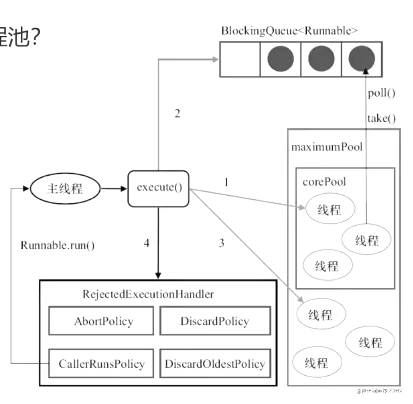 ThreadLocal是Java里一种特殊的变量。ThreadLocal为每个线程都提供了变量的副本,使得每个线程在某一时间訪问到的并非同一个对象,这样就隔离了多个线程对数据的数据共享。 在内部实现上,每个线程内部都有一个ThreadLocalMap,用来保存每个线程所拥有的变量副本。 线程池基本原理。 在开发过程中,合理地使用线程池能够带来3个好处。 第一:降低资源消耗。第二:提高响应速度。第三:提高线程的可管理性。 1)如果当前运行的线程少于corePoolSize,则创建新线程来执行任务(注意,执行这一步骤需要获取全局锁)。 2)如果运行的线程等于或多于corePoolSize,则将任务加入BlockingQueue。 3)如果无法将任务加入BlockingQueue(队列已满),则创建新的线程来处理任务。 4)如果创建新线程将使当前运行的线程超出maximumPoolSize,任务将被拒绝,并调用RejectedExecutionHandler.rejectedExecution()方法。